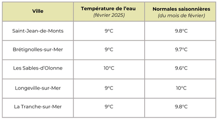 Température de l'eau pour la Vendée : aux alentours de 9 degrés en moyenne pour ce mois de février 2025, contre une moyenne de normales saisonnières de 9.8°C.