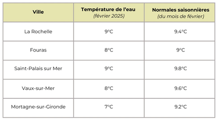 Température de l'eau pour la Charente-Maritime : aux alentours de 8.2 degrés en moyenne pour ce mois de février 2025, en dessous des normales saisonnières de 9.4°C.