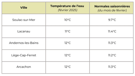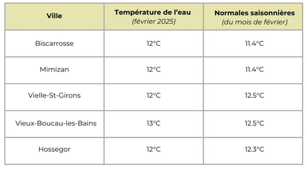 Température de l'eau pour les Landes : aux alentours de 12.2 degrés en moyenne pour le mois de février 2025, contre une moyenne de normales saisonnières de 12°C.