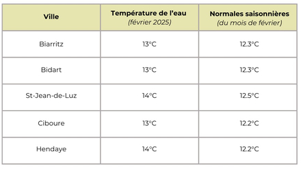 Température de l'eau pour les Pyrénées Atlantiques : aux alentours de 13.4 degrés en moyenne pour ce mois de février 2025, contre une moyenne de normales saisonnières de 12.2°C.