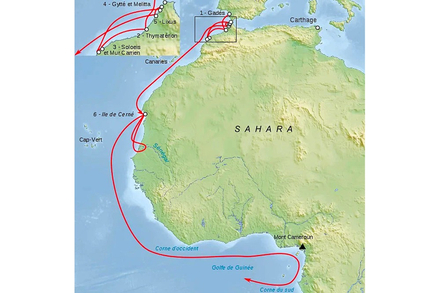 À une époque où la Méditerranée était le centre du monde connu, Hannon a choisi de regarder au-delà du Pillars of Hercules (les colonnes d’Hercule, c’est-à-dire Gibraltar). Son expédition le conduit d’abord à établir des comptoirs le long de la côte atlantique du Maroc et de la Mauritanie. Puis, il pousse plus loin : le long du Sénégal, de la Gambie... jusqu’à une mystérieuse région tropicale décrite comme couverte de forêts, d’animaux étranges et d’une chaleur étouffante.