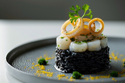 Servi dans une assiette blanche, le risotto à l’encre de seiche impose immédiatement son contraste visuel. Noir brillant, presque laqué, il capte la lumière et titille les curiosités. C’est un plat qui interpelle autant les pupilles que les papilles.