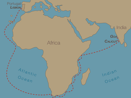 En novembre, ils atteignent le cap de Bonne-Espérance, redoutable barrière de tempêtes et de récifs. Pour beaucoup, c’est déjà un miracle. Mais le plus dur reste à faire. La côte est africaine leur réserve un accueil tendu : au Mozambique et à Mombasa, les Portugais sont perçus comme des intrus ; à Malindi, enfin, la chance sourit. Le sultan leur fournit un pilote de génie, sans doute un Indien ou un Arabe, qui connaît les vents de mousson et guide la flotte vers l’Inde.