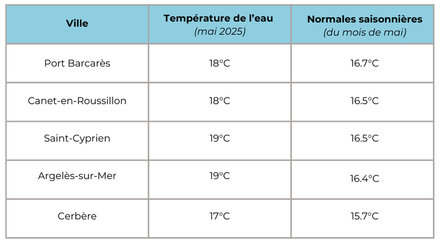 Température de l'eau pour les Pyrénées Orientales : aux alentours de 18,2 degrés en moyenne pour cette quatrième semaine de mai 2025, deux degrés au-dessus de la moyenne des normales saisonnières de 16,8°C.