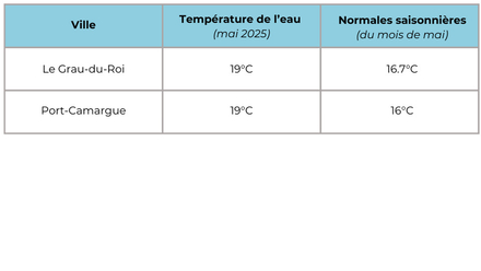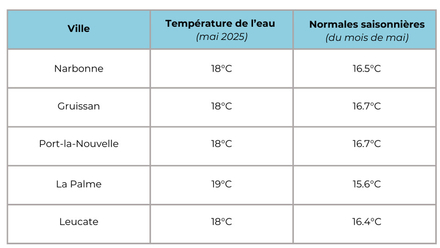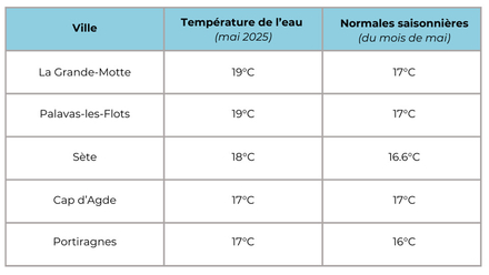 Température de l'eau pour l'Hérault : aux alentours de 18 degrés en moyenne pour cette quatrième semaine de mai 2025, contre une moyenne des normales saisonnières de 16,7°C.