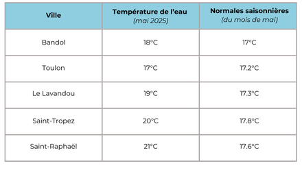 Température de l'eau pour le Var : aux alentours de 17 degrés en moyenne pour cette quatrième semaine de mai 2025, au-dessus de la moyenne des normales saisonnières de 17,4°C.