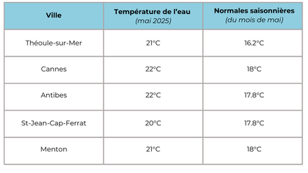 Température de l'eau pour les Alpes-Maritimes : aux alentours de 21,2 degrés en moyenne pour cette quatrième semaine de mai 2025, contre une moyenne de normales saisonnières de 17,6°C.