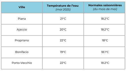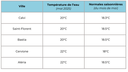 Température de l'eau pour la Haute-Corse : aux alentours de 20,8 degrés en moyenne pour cette quatrième semaine de mai 2025, contre 18,1°C pour la moyenne des normales saisonnières.