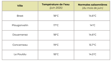 Température de l'eau pour le Finistère : aux alentours de 18 degrés en moyenne pour cette quatrième semaine du mois de juin, supérieures à la moyenne des normales saisonnières de 14,7°C.