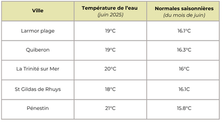 Température de l'eau pour le Morbihan : aux alentours de 19,4 degrés en moyenne pour cette quatrième semaine du mois de juin 2025, supérieures à la moyenne des normales saisonnières de 16,1°C .