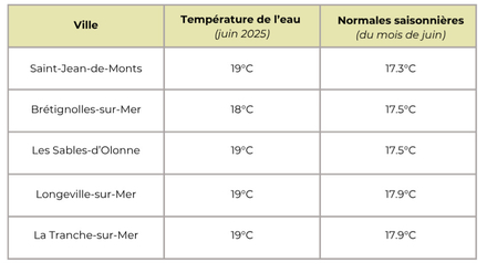 Température de l'eau pour la Vendée : aux alentours de 18,8 degrés en moyenne pour cette quatrième semaine du mois de juin 2025, supérieures à la moyenne des normales saisonnières de 17,6°C.