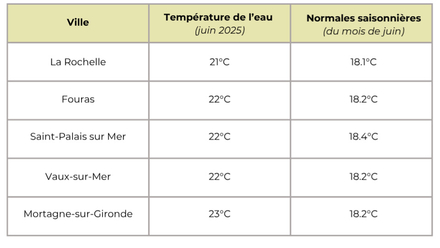 Température de l'eau pour la Charente-Maritime : aux alentours de 22 degrés en moyenne pour cette quatrième semaine du mois de juin 2025, contre une moyenne des normales saisonnières de 18,2°C.