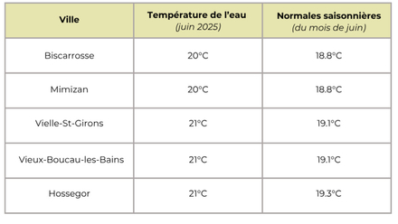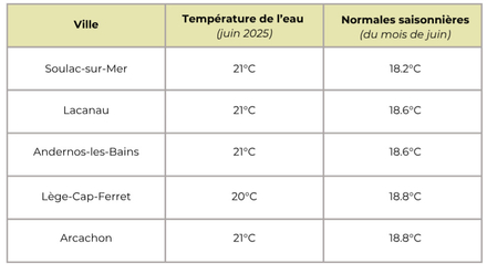 Température de l'eau pour les Landes : aux alentours de 20,6 degrés en moyenne pour cette quatrième semaine du mois de juin 2025, au-dessus de la moyenne des normales saisonnières de 19°C.