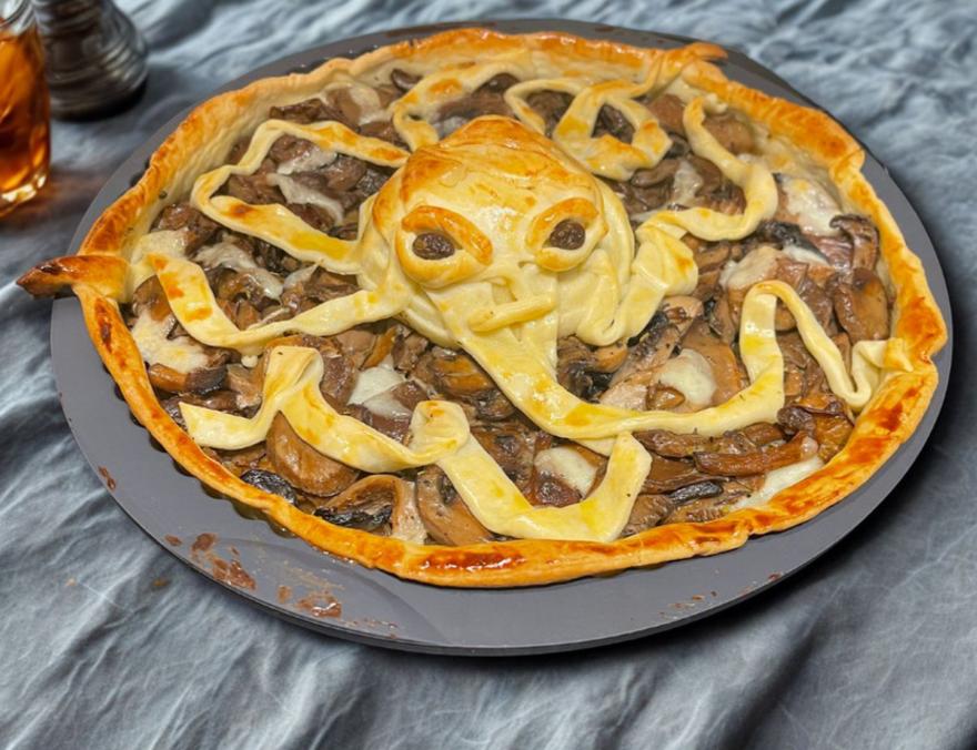 Alors que les soirées d’automne s’allongent et que l’ambiance se charge de mystère, le moment est parfait pour revisiter la cuisine de saison avec un brin de folie. Ce Kraken salé évoque les profondeurs marines : sa tête croustillante abrite une farce fondante, ses tentacules dorées se déploient sur une tarte aux parfums de forêt... un spectacle aussi beau à regarder qu’à déguster.