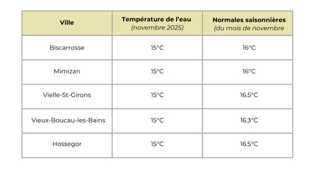 Température de l’eau pour les Landes : aux alentours de 15 degrés en moyenne pour le mois de novembre 2025, contre une moyenne de normales saisonnières de 16.3°C.