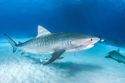 Reconnaissable à ses rayures verticales caractéristiques, le requin-tigre peut atteindre 5,5 mètres et figure parmi les requins les plus polyvalents de l’océan.