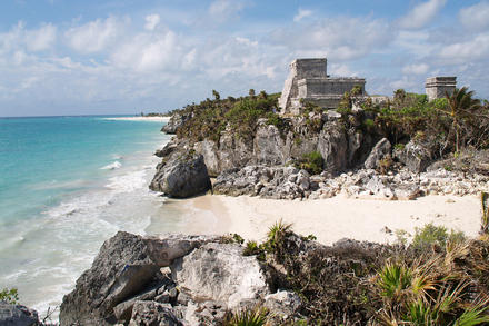 Sur la côte caraïbe du Yucatán, les ruines de Tulum dominent une étroite bande de sable blanc. L’ancienne cité fortifiée contrôlait les échanges maritimes entre le golfe du Mexique et les Caraïbes. Les navires mayas s’y présentaient déjà dans la passe du récif pour charger et décharger leurs marchandises.