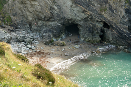 Au pied des ruines de Tintagel, en Cornouailles, une petite plage de galets disparaît entièrement à marée haute. La célèbre Merlin’s Cave traverse le promontoire et se visite à marée basse.