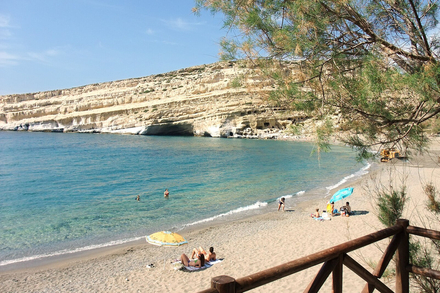En Crète, la baie de Matala est bordée de falaises percées de grottes, occupées dès l’Antiquité puis par les communautés hippies dans les années 1960. La mythologie grecque y place l’arrivée de Zeus, transformé en taureau, venant déposer la princesse Europe sur le sable.