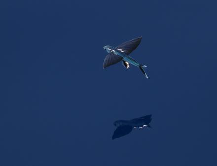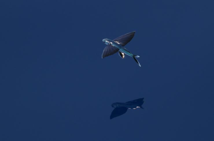 Contrairement à ce que son nom laisse penser, le poisson volant ne vole pas réellement. Il utilise une technique de propulsion extrêmement efficace. En prenant de la vitesse sous l’eau grâce à de puissants battements de queue, il jaillit à la surface et déploie ses longues nageoires pectorales, parfois complétées par des nageoires pelviennes élargies selon les espèces. Ces nageoires forment de véritables ailes rigides qui lui permettent de planer au-dessus de la surface.