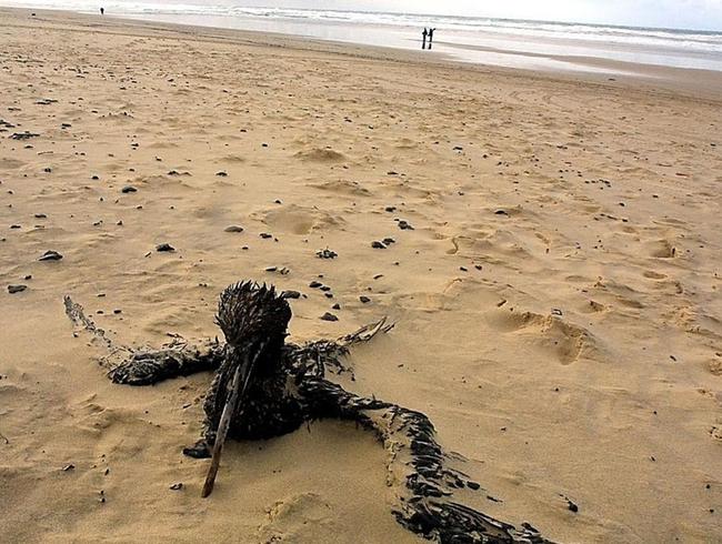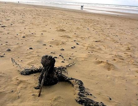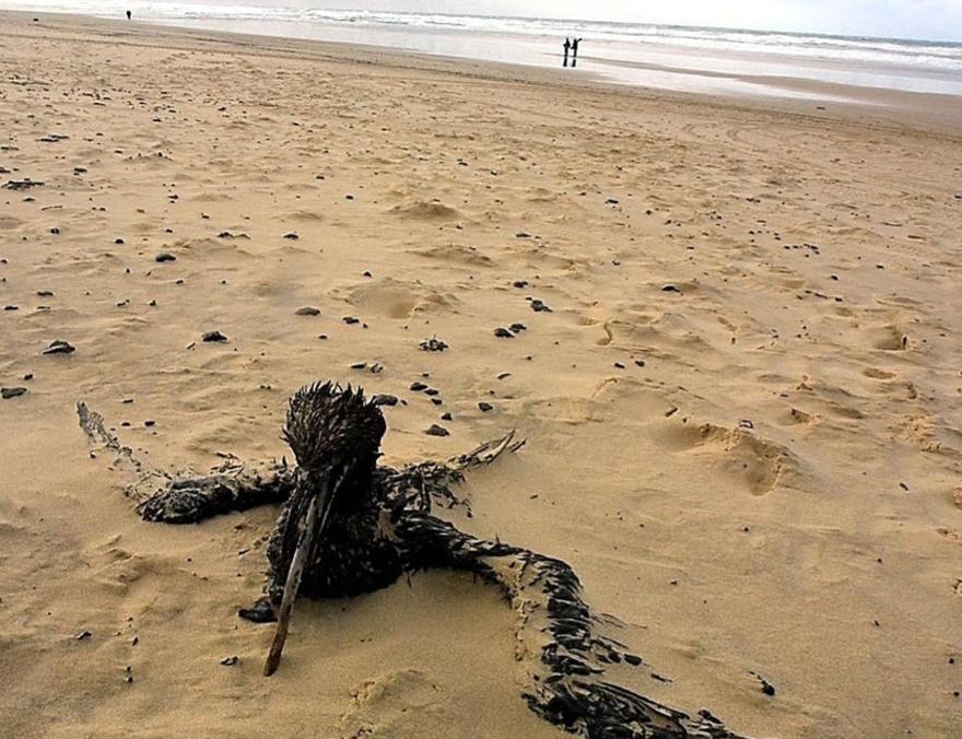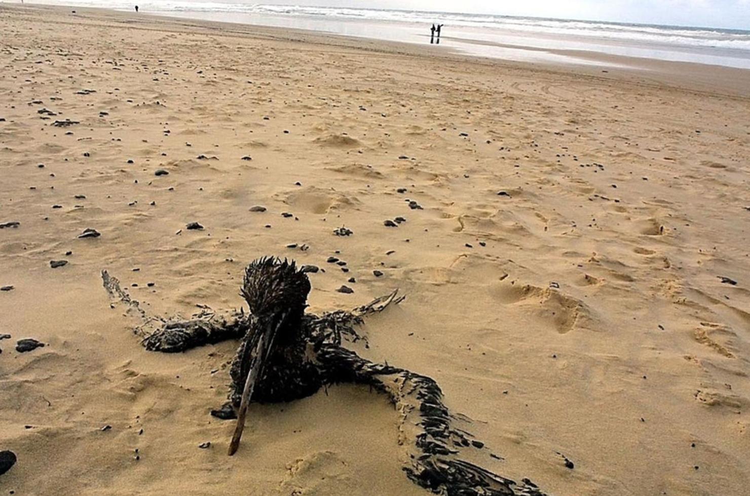 Illustration d'un oiseau mazouté, plage du Grand Crohot près de Lège-Cap-Ferret, 4 janvier 2003.?