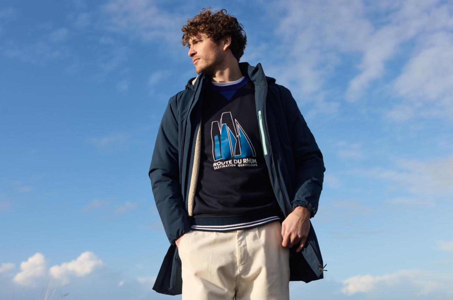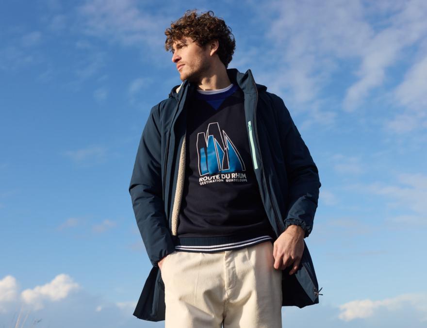 Avec plus de 70 références, la collection Route du Rhum – Destination Guadeloupe 2026 se distingue par son ampleur. Elle s’adresse à tous les publics, de l’amateur de voile au visiteur du village départ, avec des modèles pour homme, femme, enfant, bébé et une gamme complète d’accessoires. Le vestiaire technique occupe une place centrale, avec des pièces conçues pour protéger du froid, de la pluie et du vent. Parkas, cirés, softshells ou polaires sont directement issus de la gamme Bermudes, la marque nautisme du groupe Armor-lux, reconnue pour son expertise des vêtements fonctionnels dédiés aux usages maritimes. Ces articles répondent aux contraintes réelles de la navigation comme à celles des balades en bord de mer. À côté de ces pièces techniques, la collection met en avant les incontournables de la maison Armor-lux. Marinières en coton interlock, pulls marins, sweats, polos, t-shirts et débardeurs composent un vestiaire plus lifestyle, où le savoir-faire textile s’exprime pleinement. Sérigraphies et broderies viennent renforcer l’identité de la collection, dans un équilibre mesuré entre visibilité de l’événement et sobriété propre à la marque.