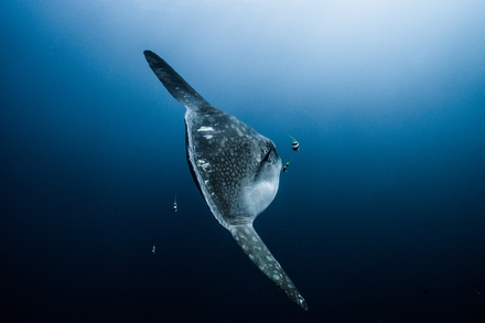 C’est l’une des scènes les plus étonnantes qu’un navigateur puisse observer : une grande masse grise, aplatie, qui dérive à fleur d’eau, parfois sur le côté, parfois presque immobile. Ce comportement intrigue depuis longtemps. L’une des hypothèses les plus solides est qu’il s’agirait d’une phase de réchauffement après des plongées en eaux plus froides, ou d’un moyen de faciliter l’élimination de parasites, parfois avec l’aide d’oiseaux ou de petits poissons nettoyeurs. Car le poisson- lune traîne souvent une lourde charge parasitaire. Cette vulnérabilité explique en partie certains comportements spectaculaires, comme les sauts hors de l’eau observés chez l’espèce. Derrière sa placidité apparente, il mène donc une existence plus physique qu’on ne le croit, rythmée par les plongées, les remontées en surface et les interactions avec tout un petit monde de nettoyeurs opportunistes.