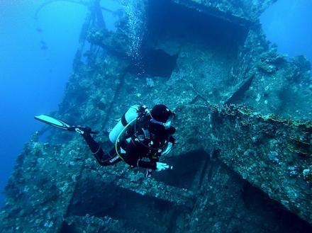 En nageant dans le dédale de cette épave, vous vous retrouverez dans deux mondes antagonistes : les restes d’un monde luxueux et de paix et le chaos des instruments de guerre. Ces derniers sont autant des armes, des canons, l’apanage typique des équipements militaires (masque à gaz, munitions)… que des véhicules tels des 4x4 GMC mais aussi des tanks tantôt renversés, tantôt à l’endroit… Le pont-promenade constitue une belle balade pour les pièces d’artillerie. Un autre site extrêmement prisé des plongeurs est la salle des machines.