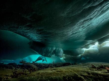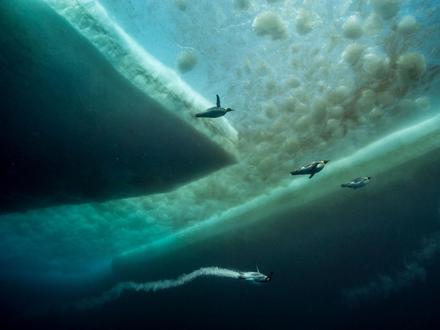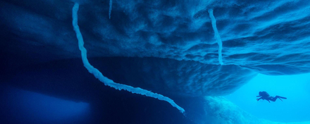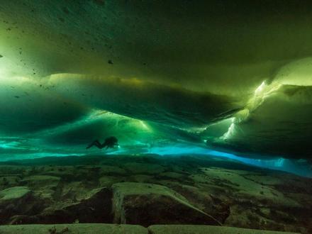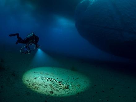 Une fois sous la glace, le spectacle commence. Des milliers de petits cristaux se mettent alors en mouvement et rejoignent la surface, vers le trou, comme pour vite refermer la porte de cet autre monde. Parce qu'il s'agit bien d'un autre monde... Contrairement à ce que l'on pourrait croire, les profondeurs de l'Antarctique regorgent de vie et de couleurs ! Mais ce qui surprend d'abord, c'est la lumière : pure, intacte. Le plancton brille... Une aubaine pour un photographe !