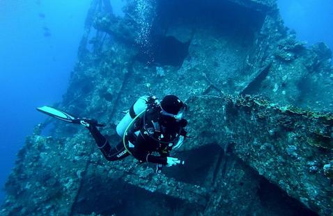 L’une des épaves les plus connues est celle du Fujikawa Maru. Il repose entre 30m et 40m de profondeur, on y trouve des avions de la flotte japonaise, les fameux « Zero » en bon état et enfermés dans la cale numéro 2, des armes à feu de l’époque et aussi des baignoires japonaises ! Elle est aussi recouverte de coraux durs et mous. La proue et la poupe sont ornées de crinoïdes. Plus en profondeur encore se cache la salle des machines.
