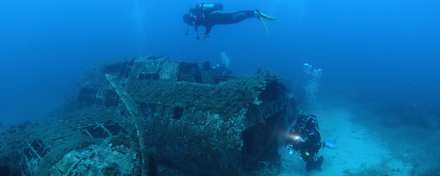 En descendant sur lui, la vision panoramique du bombardier en impose, avec ses deux longues ailes, quasiment intactes, supportant les quatre gros moteurs à hélices. On imagine l'appareil : 32 m d'envergure, 22 m de long, près de 30 tonnes à plein, 13 mitrailleuses, entre deux et trois tonnes de bombes, il embarquait aussi dix membres d'équipage… Le B17 garde fière allure, même coupé de sa queue, le fuselage arrière éventré, et privé de son nez. Le poste de pilotage est également à ciel ouvert, mais les sièges sont toujours accrochés et une partie des commandes en place. Des quatre moteurs, un seul conserve ses trois pales (elles sont en partie manquantes sur les autres). L'avion est aujourd'hui un refuge pour les poissons. Sans qu'elle soit abondante, on y rencontre la petite faune habituelle de la Méditerranée : les serrans-écriture, les apogons colorés et les castagnoles, les groupes de sars, des petits labres. Quelques chapons et murènes sont en résidence. Parfois, des langoustes squattent aussi les lieux. Avec le temps, les éponges encroûtantes ont colonisé et joliment coloré la tôle, accueillant toute une faune fixée de spirographes ou de serpules. Depuis 70 ans, une nouvelle vie a commencé ici.