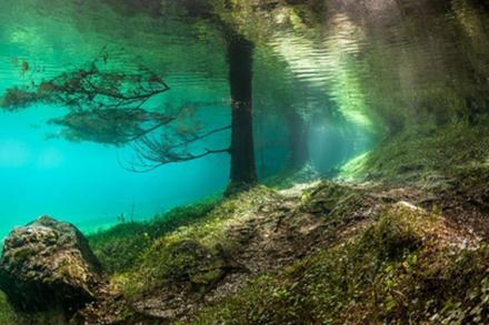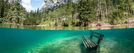 Le parc Tragoess en Autriche mérite d'être visité deux fois : en hiver pour admirer la forêt verdoyante à l'occasion d'une randonnée au grand air, et à l'arrivée des beaux jours pour plonger dans le lac éphémère ! En effet, dès l'arrivée du printemps, la calotte enneigée du mont Hochschwab fond et les arbres et chemins du parc sont submergés par 4 mètres d'eau limpide, voire 12 mètres à certains endroits, aux couleurs vert émeraude du fait des arbres et chemins herbeux immergés.