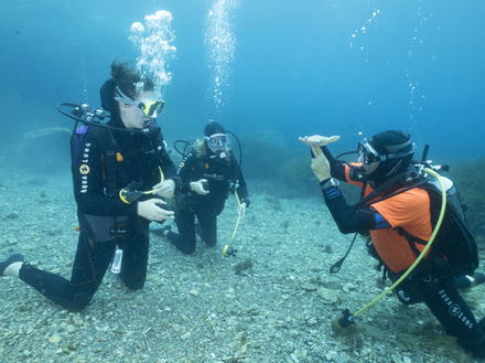 Je partage l’ensemble de ma formation avec une autre novice. Sur les conseils de notre instructeur, nous nous sommes accordées pour suivre les mêmes sessions. Ainsi nous pouvons nous entraider quand c’est possible, notamment lors de la préparation du matériel ; nous partageons nos impressions après les immersions, parfois je réalise que nous n’avons pas du tout vécu la même plongée. Elle trouve des facilités là où j’ai pu avoir des difficultés et vice versa. Ne maîtrisant pas toujours notre équilibre au début de notre formation, nous nous pardonnons les divers coups de palmes non contrôlés lorsque nous suivons notre instructeur. Nous découvrons également la bienveillance des autres plongeurs qui, plus expérimentés, n’hésitent pas à partager, sur le bateau ou de retour sur la plage, leur expérience et leurs conseils. Chacun y va de sa petite astuce ou anecdote pour faciliter le montage d’une bouteille, améliorer sa technique de palmage ou maîtriser sa consommation d’air…