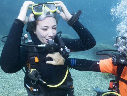 Le baptême de plongée est une première expérience, un premier pas dans le milieu sous-marin pendant lequel on ne maîtrise rien et où on se laisse simplement porter, émerveillé par ce nouveau monde. C’était une expérience totalement inédite, les sensations nouvelles sous l’eau, le matériel sur les épaules, la respiration avec le détendeur… Une véritable plongée dans l’inconnu dont je suis ressortie émerveillée mais avec une sensation de trop peu. J’en voulais plus : aller plus loin, plus longtemps et surtout apprendre à maîtriser tout ce matériel pour ne plus être simple spectatrice. Comme beaucoup de novices ayant testé cette introduction à la plongée, le passage du premier niveau s’est imposé à moi comme la meilleure des solutions pour profiter sur le long terme de cet univers sous-marin. Je choisis de me former de nouveau à Hyères, dans la petite structure de la Tribubulles qui m’avait accueillie lors de mon baptême. Après avoir récupéré notre matériel et nous être équipés nous voilà tous partis au large de Hyères. Je m’attendais à une partie d’explications théoriques sur le bateau avant de se mettre à l’eau mais, une fois de plus il n’en est rien, je me retrouve en surface pour me réhabituer quelques minutes à respirer avec le détendeur en bouche.