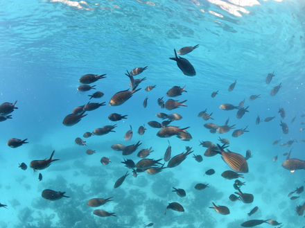 À une trentaine de kilomètres à l’ouest de la métropole marseillaise, une autre aventure vous attend à Carry-le-Rouet, petite station balnéaire située dans le parc marin de la Côte bleue. « Le parcours s’effectue sans palmes pour éviter d’abîmer les fonds, et grâce à la combinaison on flotte sur l’eau », explique Cora Ollier, chargée de mission du milieu marin de la Côte bleue. Eau claire, petits fonds sableux et rocheux, herbiers de posidonies et explosion de vie, découvrez tranquillement cet environnement en suivant le guide animateur du parc marin. Pas de panneaux explicatifs, mais un sentier praticable toute l’année. La randonnée subaquatique est d’ailleurs la seule activité humaine tolérée – car sans impact pour le milieu. « On constate directement l’effet réserve », affirme Cora Ollier, « les poissons n’ont pas peur de l’homme. Ils se laissent approcher facilement et les individus sont de grosse taille et nombreux, il y a également beaucoup de prédateurs comme les loups, les dorades ». Au printemps, il est même possible d’apercevoir une tortue Caouanne, espèce endémique de Méditerranée, et même des dauphins quand ils osent s’aventurer dans la réserve.