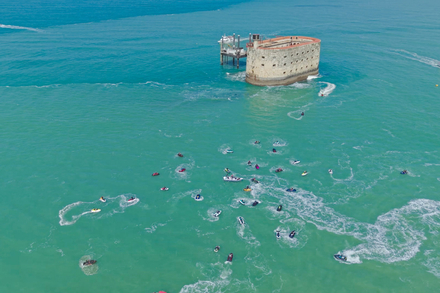 Le lendemain, une soixantaine de passionnés s’est réunie pour partager une expérience unique en motomarine. Organisées en groupes encadrés par des guides expérimentés, près de quarante unités ont pris le départ de La Tremblade. L’itinéraire a conduit les participants à admirer des sites emblématiques tels que l’île Madame, l’île d’Aix, et bien sûr, Fort Boyard. Le déjeuner s’est transformé en pique-nique géant sur la plage de Gatseau où les participants ont alterné le reste de la journée entre figures acrobatiques sur leurs scooters des mers et jeux de plage, renforçant l’esprit de camaraderie qui caractérisait l’événement.