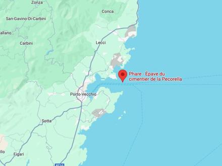 La roche de la Pecorella est un minuscule îlot surmonté d’un phare. A l’embouchure du golfe de Porto-Vecchio, entre la pointe de San Ciprianu et celle de Chiappa. Il représente la partie émergée d’une petite dorsale rocheuse qui se prolonge d’est en ouest, à une profondeur de cinq mètres. Atteindre l’îlot de la Pecorella nécessite donc une embarcation. Puis, en partant du phare direction ouest (donc en vous dirigeant vers le fond du golfe), et en suivant la dorsale rocheuse sur une cinquantaine de mètres, vous découvrirez l’épave, imposante, posée bien droite sur le fond.
