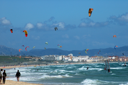 Face au détroit de Gibraltar, Tarifa reste la référence absolue pour les kitesurfeurs du monde entier. Ici, le vent ne s’arrête presque jamais : Levante d’un côté, Poniente de l’autre, les sessions s’enchaînent douze mois par an. Les longues plages de sable blond laissent assez d’espace pour cohabiter entre écoles, freestylers et amateurs de vagues. Malgré une fréquentation record chaque été, la ville a su préserver l’esprit "ride libre", avec ses bars en bord de mer et sa culture du vent omniprésente. Tarifa ne se contente pas d’exister : elle respire littéralement le kitesurf.