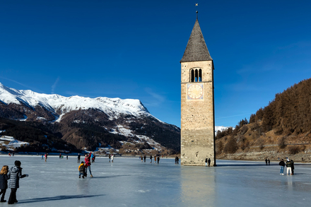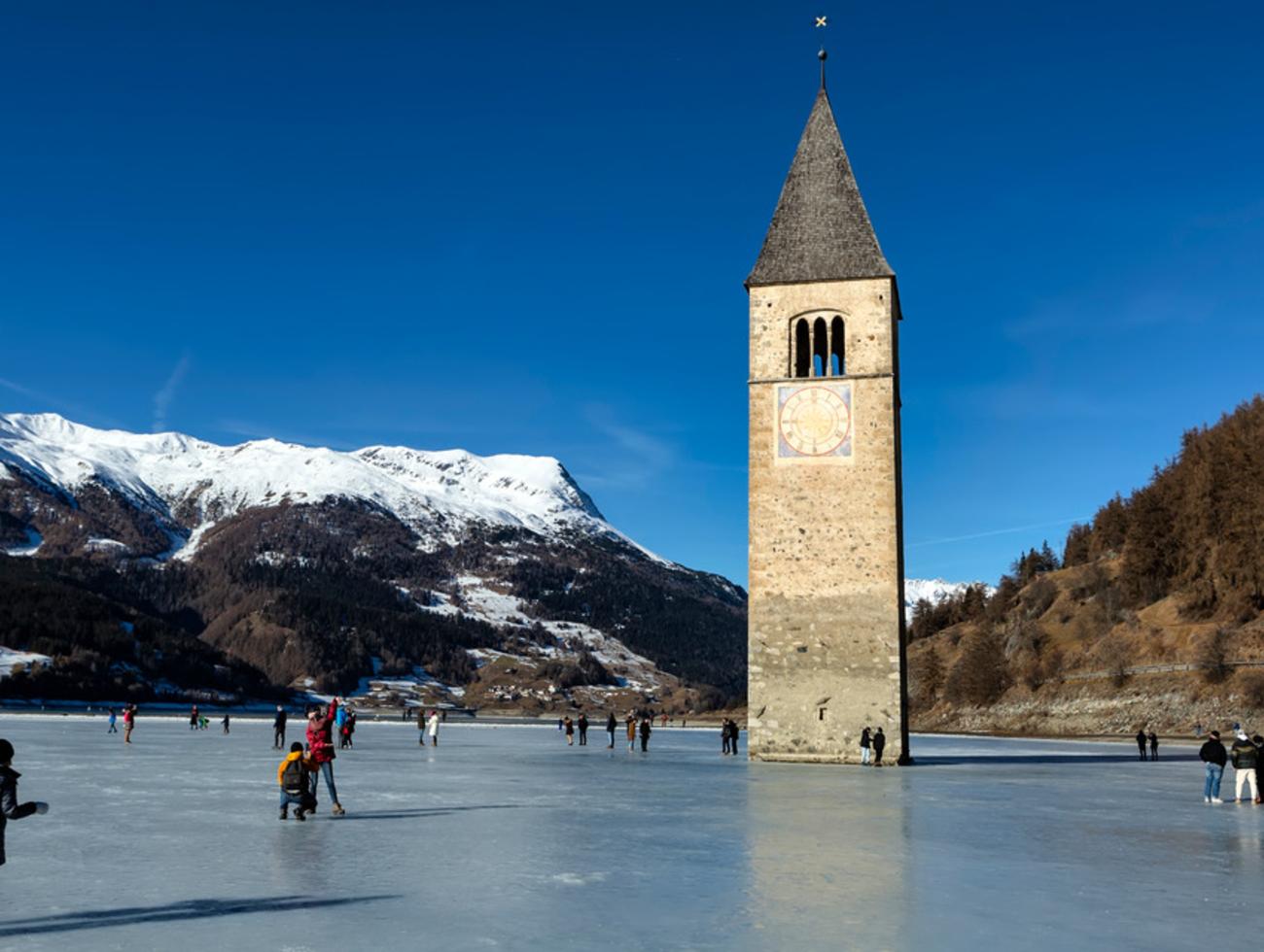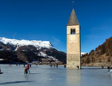 Dans le Tyrol du Sud, le lac de Resia se fige chaque hiver dans une atmosphère saisissante. Le célèbre clocher roman qui émerge de la glace, vestige d’un village englouti au milieu du XXe siècle, donne au site une dimension presque irréelle. Patiner ici, c’est évoluer sur une vaste surface gelée entourée de montagnes, avec cette impression de glisser au milieu d’un décor figé, où l’histoire et le paysage se confondent. Le froid sec et l’altitude accentuent le sentiment d’isolement et renforcent le caractère unique de l’expérience.