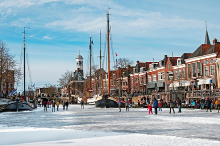 Dans le nord des Pays-Bas, Dokkum incarne à elle seule la tradition du patinage sur canaux. Lorsque les hivers sont suffisamment rigoureux, le réseau de voies d’eau devient une immense patinoire naturelle. Cette ville frisonne fait partie du tracé mythique de l’Elfstedentocht, une course légendaire profondément ancrée dans l’imaginaire collectif néerlandais. Glisser sur ces canaux étroits, bordés de maisons anciennes et ponctués de petits ponts, offre une immersion directe dans un mode de vie où la glace a longtemps été un moyen de déplacement autant qu’un loisir.