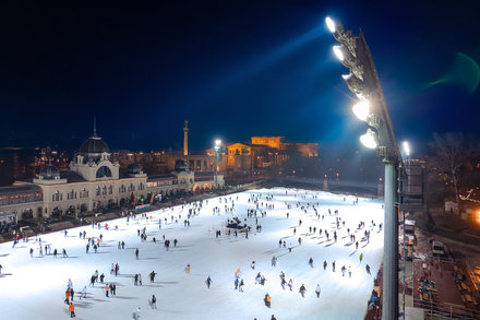Située au cœur du parc municipal de Budapest, la Városligeti M?jégpálya est l’une des plus grandes et des plus anciennes patinoires extérieures d’Europe. Entourée de bâtiments historiques et du château de Vajdahunyad, elle offre un décor élégant et monumental. Patiner dans ce cadre, c’est profiter d’un contraste saisissant entre l’animation de la glace et la solennité de l’architecture environnante. En fin de journée, lorsque la lumière hivernale puis l’éclairage nocturne se reflètent sur la surface gelée, le lieu prend une atmosphère presque théâtrale.