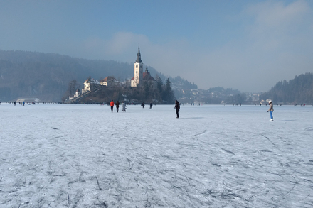 Lorsque l’hiver est suffisamment froid, le lac de Bled peut se transformer en patinoire naturelle au pied des Alpes juliennes. Le décor est particulièrement marquant, avec l’île et son église au centre du lac, dominées par un château médiéval perché sur une falaise. Patiner dans ce cadre donne l’impression d’évoluer dans une scène de conte hivernal, où la glace, la pierre et les reliefs alpins se répondent. Le site séduit autant par son esthétique que par l’ambiance paisible qui s’en dégage en hiver.