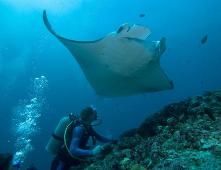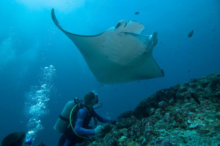 Dans le parc national de Komodo, classé au patrimoine mondial de l’UNESCO, les mantas sont présentes toute l’année sur des sites devenus mythiques comme Manta Point ou Karang Makassar. Ici, les courants soutenus concentrent le plancton et attirent les raies vers des stations de nettoyage où de petits poissons débarrassent leur peau des parasites. Les plongées se déroulent généralement entre 10 et 25 m de profondeur. L’eau oscille entre 25 et 28 °C, avec une visibilité variant selon la saison et l’intensité des courants. Un niveau Advanced est recommandé en raison des conditions parfois sportives, notamment lors des changements de marée. Les croisières plongée de 4 à 7 jours, formule la plus courante pour explorer la zone, s’échelonnent entre 900 et 2 500 € selon le standing du bateau. L’expérience ne se limite pas aux mantas : récifs foisonnants, requins de récif et paysages volcaniques contribuent à faire de Komodo l’une des destinations les plus complètes d’Asie du Sud-Est.