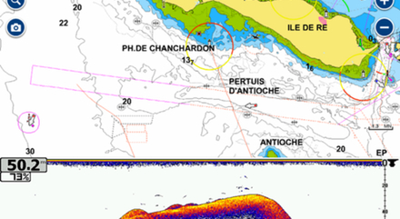 C’est sans aucun doute l’appli de navigation la plus chargée sur smartphone, tablette et PC. Grâce au partenariat avec la société américaine Vexilar, cette application permet d’afficher un sondeur graphique. Cette fonctionnalité SonarPhone donne la possibilité d’afficher sur l’écran (iPhone ou iPad) les cartes et le sondeur en mode partagé et d’être informé en temps réel sur sa propre position et la profondeur.