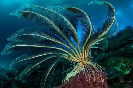 A 70 mètres de profondeur, limite des plongées du photographe, la diversité est incroyable : des méduses, des coquillages, des coraux, des éponges, des petits poissons multicolores... Toutes les couleurs des récifs tropicaux sous la banquise !