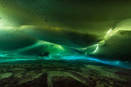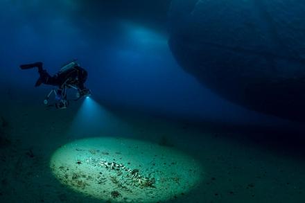 Une fois sous la glace, le spectacle commence. Des milliers de petits cristaux se mettent alors en mouvement et rejoignent la surface, vers le trou, comme pour vite refermer la porte de cet autre monde. Parce qu'il s'agit bien d'un autre monde... Contrairement à ce que l'on pourrait croire, les profondeurs de l'Antarctique regorgent de vie et de couleurs ! Mais ce qui surprend d'abord, c'est la lumière : pure, intacte. Le plancton brille... Une aubaine pour un photographe !