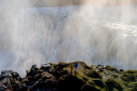 Surnommée la plus puissante cascade d’Europe, Dettifoss déverse un torrent impressionnant qui fait vibrer le sol sous vos pieds. L’eau chute de 44 mètres dans un grondement assourdissant. À quelques minutes de marche, Selfoss, plus élégante et étalée, complète le décor. En automne, les contrastes entre la mousse verte et les eaux chargées en sédiments rendent le spectacle encore plus saisissant.