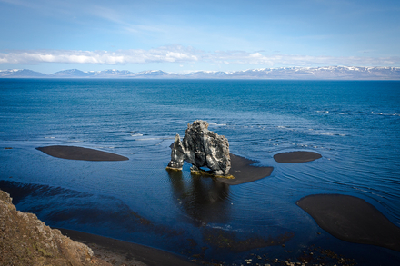Dans la baie de Vatnsnes, ce monolithe de 15 mètres, semblable à un dragon ou à un éléphant buvant dans la mer, est entouré de légendes. La plus célèbre raconte qu’il s’agit d’un troll pétrifié par le soleil. À marée basse, les phoques viennent souvent se reposer non loin, et l’arche se reflète dans les flaques laissées par la mer, offrant des images saisissantes.