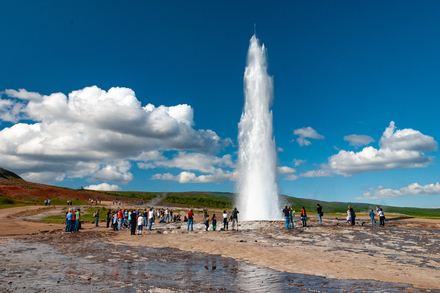 Situé dans la vallée d’Haukadalur, Strokkur propulse une colonne d’eau bouillante toutes les 5 à 10 minutes. La patience est vite récompensée par une explosion qui peut atteindre 20 mètres de hauteur. En automne, la vapeur qui s’élève dans l’air frais rend le spectacle encore plus impressionnant, surtout au lever ou au coucher du soleil.