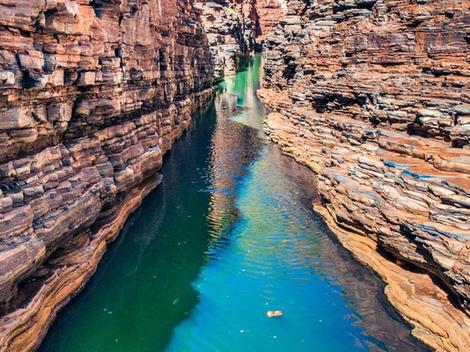 Ce qui surprend le plus dans le Parc National Karijini, c'est la présence de gorges, de gouffres et de cascades, au milieu de ce paysage ocre, rougi par le soleil. On ne s'attend pas à y trouver de l'eau, et pourtant ! Les principales gorges du parc sont : Bee Gorge, Wittenoom Gorge, Kalamina Gorge, Yampire Gorge et Dales Gorge. Cette dernière est la plus accessible : la route qui y mène est goudronnée, et ce n'est pas le cas pour la majorité des routes du parc. Dales Gorge offre une randonnée incroyable ! Au pied des falaises, les pieds dans l'eau ou au bord d'un précipice, les paysages sont spectaculaires. Vous pourrez même vous baigner. A l'ouest du parc se trouve Joffre Falls, où vous trouverez les piscines et chutes d'eau les plus incroyables du parc.